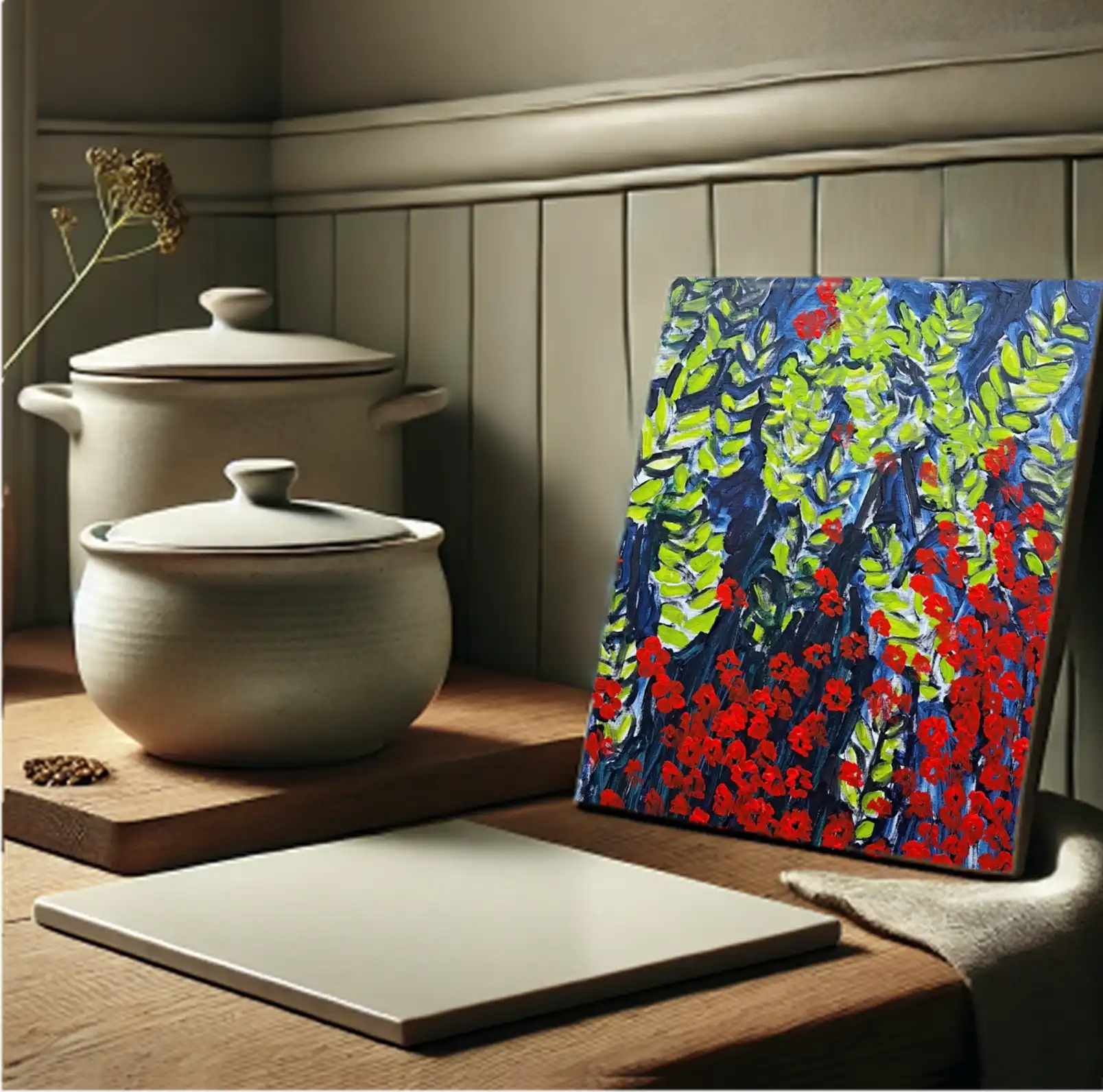 אריח קרמיקה בעיצוב אומנותי מרהיב, שיהפוך כל שולחן או משטח עבודה למוקד של יופי והשראה.